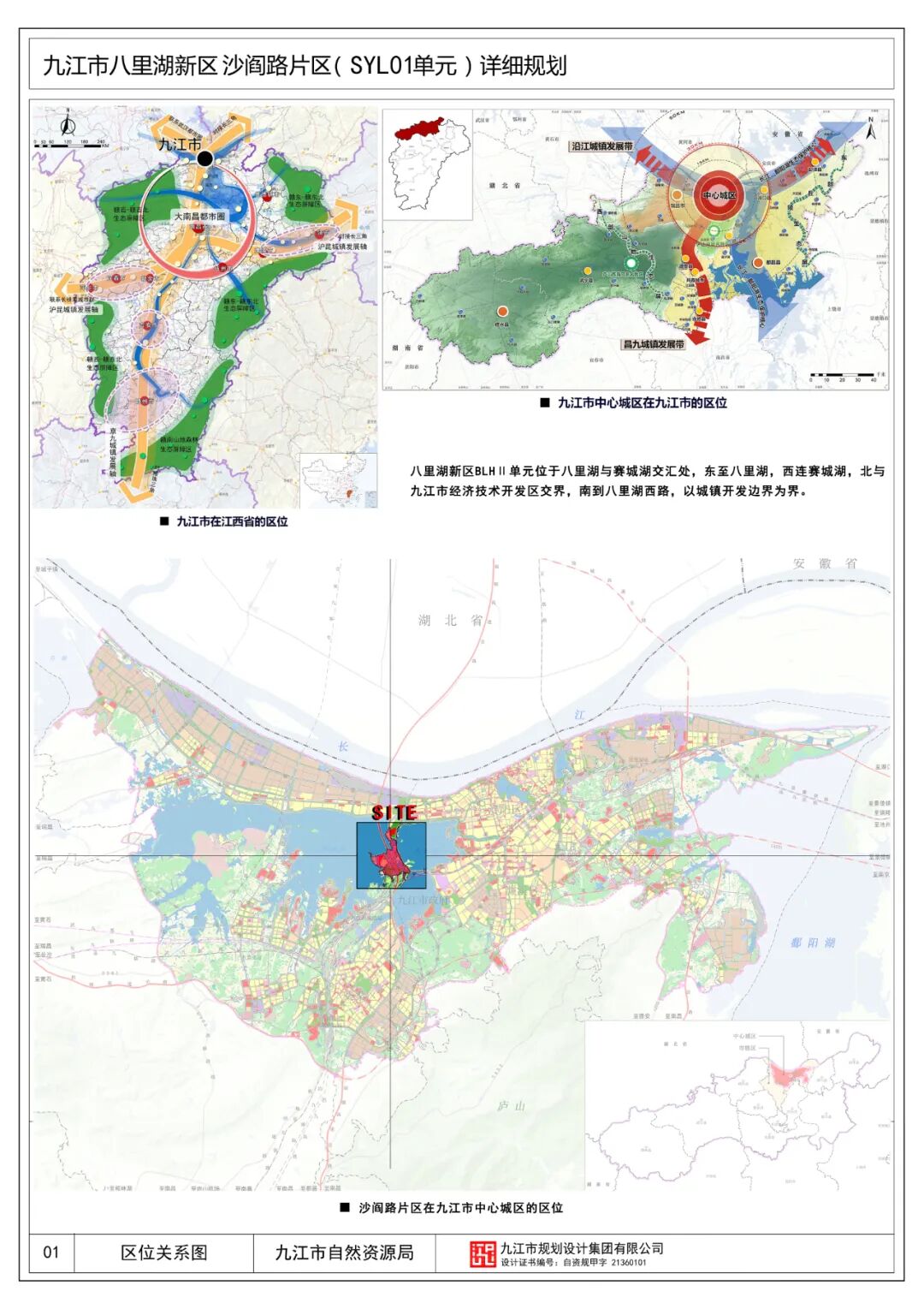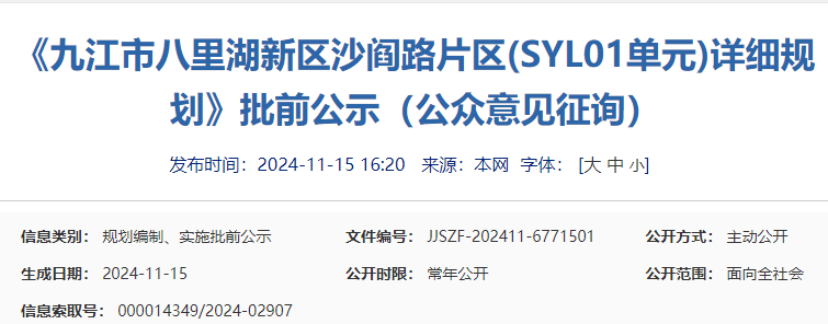 为进一步完善“五级三类”国土空间规划体系,有效传导落实国土空间总体规划,科学指导八里湖新区的规划建设,根据《中华人民共和国城乡规划法》及《自然资源部关于加强国土空间详细规划工作的通知》(自然资发2023 43号)的要求,统筹安排规划区内土地使用和各项建设,优化规划区内各地块开发强度等控制指标体系,落实道路和工程管线控制性位置以及空间环境控制要求,为八里湖新区沙阎路片区规划建设管理提供法定依据,特编制《九江市八里湖新区沙阎路片区(SYL01单元)详细规划》。二、规划范围