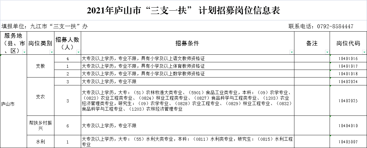 6月11日,江西省人力资源和社会保障厅发布了《2021年江西省高校毕业生“三支一扶”计划招募公告》,其中,庐山市录用计划共20名,支教人员7名,支农人员6名,帮扶乡村振兴人员6名,水利人员1名。为方便广大考生报考,现将2021年庐山市“三支一扶” 计划招募岗位信息表附后。