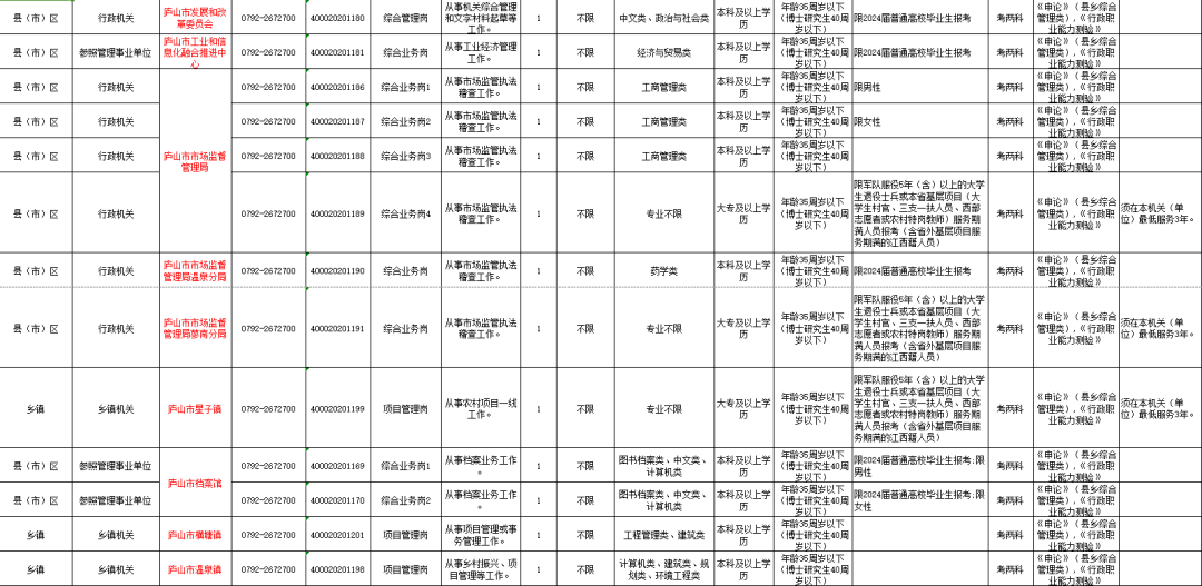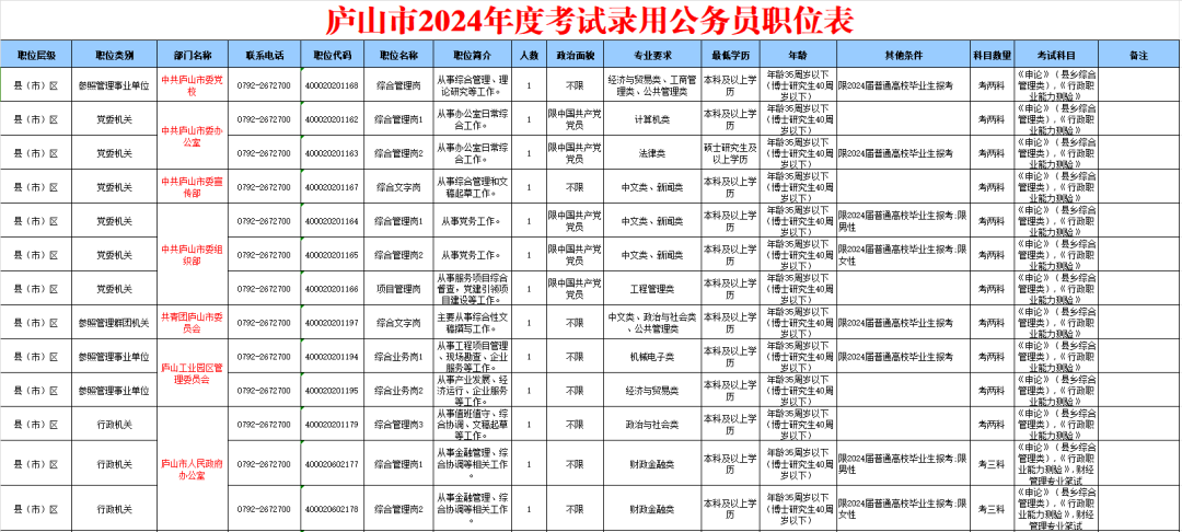 1月26日,江西省公务员局发布《江西省2024年度考试录用公务员公告》,全省录用计划共7504名,其中庐山市计划招录50名,包括市直部门33名(纪委监委、市委组织部各3名,市委办公室2名,市委宣传部、市委党校、团市委各1名,市场监管局6名、政府办公室3名,财政局、工业园区管委会、农业农村局、档案馆各2名,发改委、统计局、医保局、工信局、供销社各1名)、公检法11名(人民法院5名、人民检察院3名、庐山公安局2名、庐山市公安局1名)、乡镇6名(星子镇、横塘镇、温泉镇、蛟塘镇各1名,蓼南乡2名)。为方便广大考生报名,现将《庐山市2024年度考试录用公务员职位表》附后。
