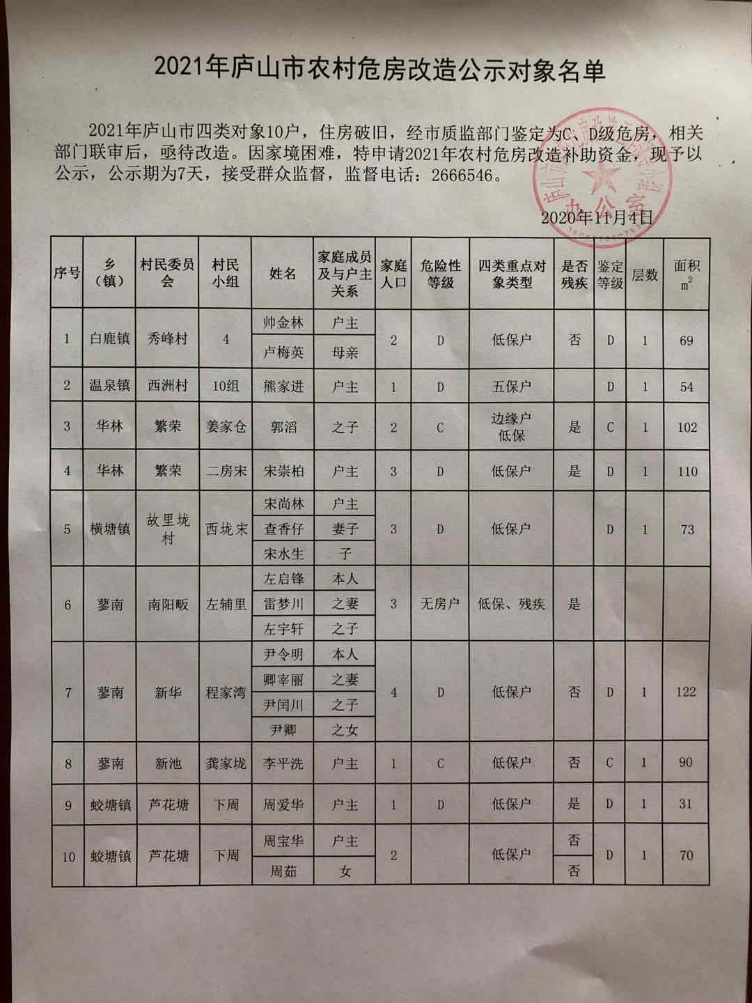 2021年庐山市农村危房改造公示对象名单