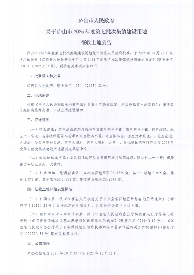 关于庐山市2025年度第七批次集镇建设用地征收土地公告