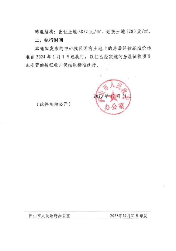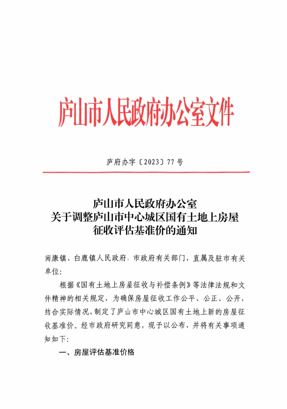 庐山市中心城区国有土地上房屋征收评估基准价调整