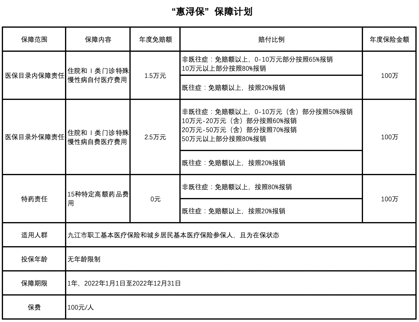 保险期间内,参保人在医保定点医疗机构因住院和Ⅰ类门诊特殊慢性病发生的必需且合理的医保目录内医疗费用,经九江市基本医疗保险、大病保险以及医疗救助等政府医疗保障报销后个人自付费用,年度内累计起付标准为1.5万元,超出起付标准以上的部分,既往症人员按照20%报销,非既往症人员按照如下规则:0-10万元部分按照65%报销、10万元以上部分按照80%报销。个人年度累计最高报销限额为100万元。