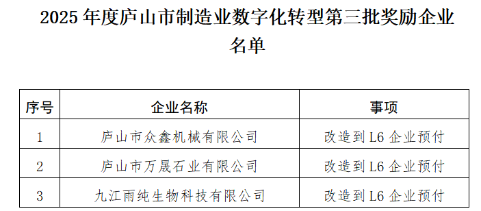 关于2025年度庐山市制造业数字化转型第三批奖励企业的公示