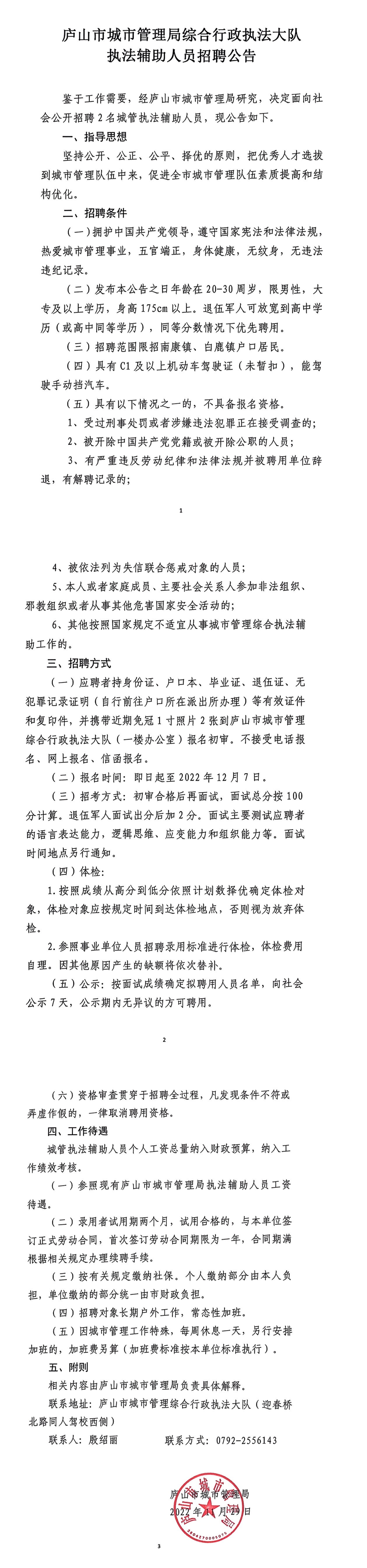 庐山市城市管理局综合行政执法大队执法辅助人员招聘公告