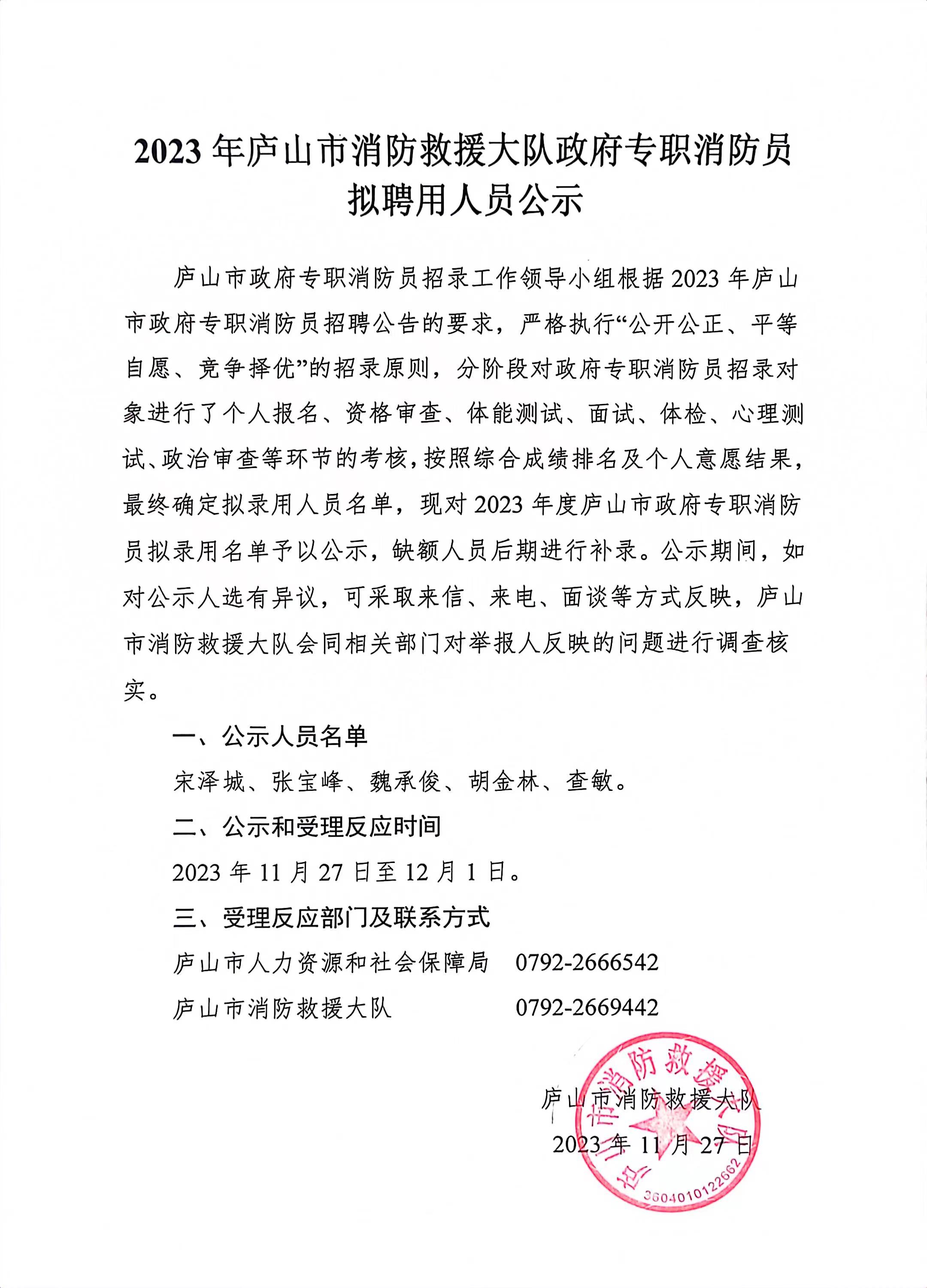 2023年庐山市消防救援大队政府专职消防员拟聘用人员公示