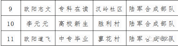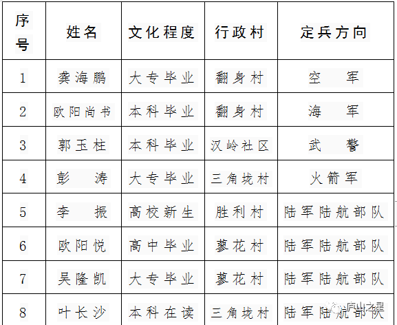 全市2020年征兵工作启动以来,经过乡镇初检初筛,市级体检政考,役前教育训练选拔,按照“双合格”条件下学历优先原则,结合个人意愿,经庐山市人民政府征兵工作领导小组会议审定,决定我镇下列11名青年应征入伍,予以公示。